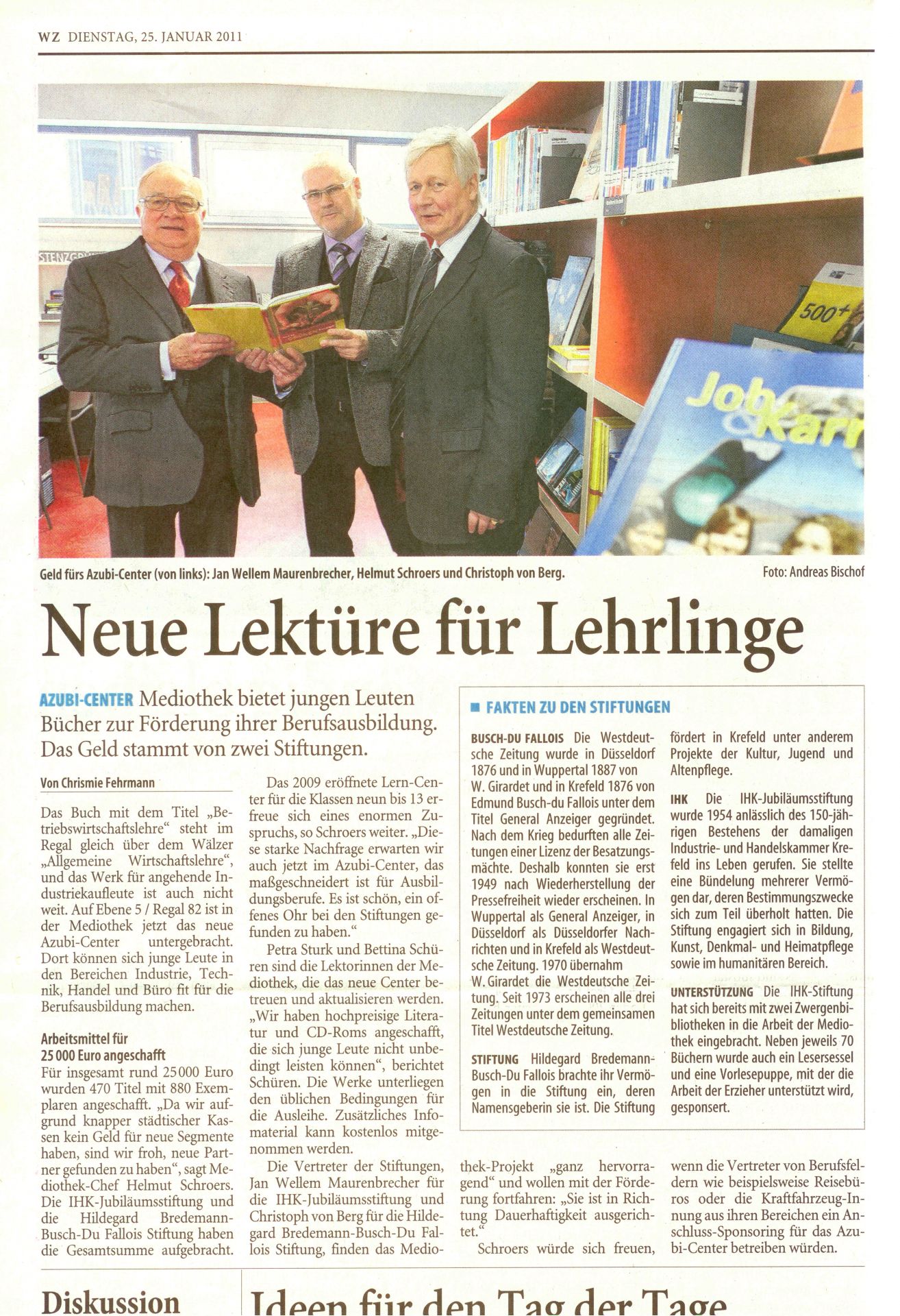 Über ein Förderprojekt der Hildegard Bredemann Busch-du Fallois-Stiftung berichtet die Westdeutsche Zeitung am 25. Januar 2011. Eine Bibliothek für Azubis...